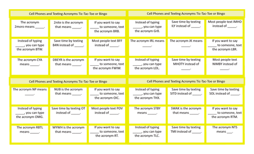 Cell Phones And Texting Acronyms Legal Size Text Tic Tac Toe Bingo Game Amped Up Learning
